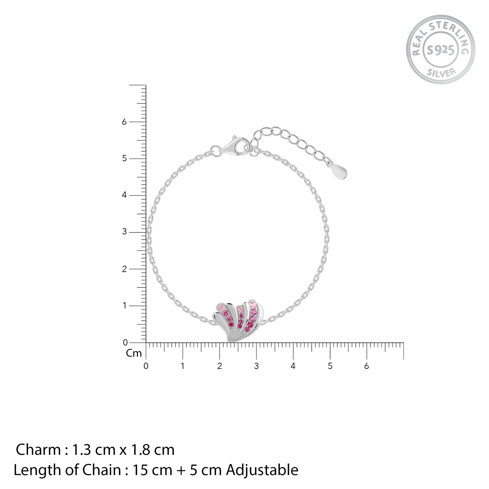 This silver bracelet for women features a wing motif with tiered, curved segments, set with alternating pink and zircon stones for a vibrant and textured look.