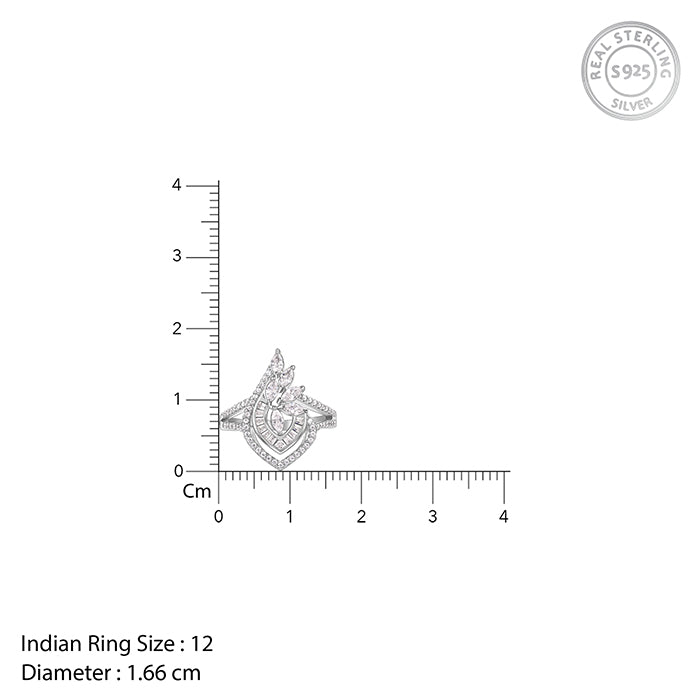 This silver ring for women features a beautiful wing-like motif studded with zircons all over.