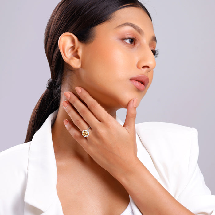 This silver womens ring features a natural, circular-shaped citrine stone at the centre, surrounded by a halo of smaller zircons. From nature’s heart to yours - Trendy Freak's natural Gemstone Collection makes every occasion special, whether you’re gifting a loved one or treating yourself.