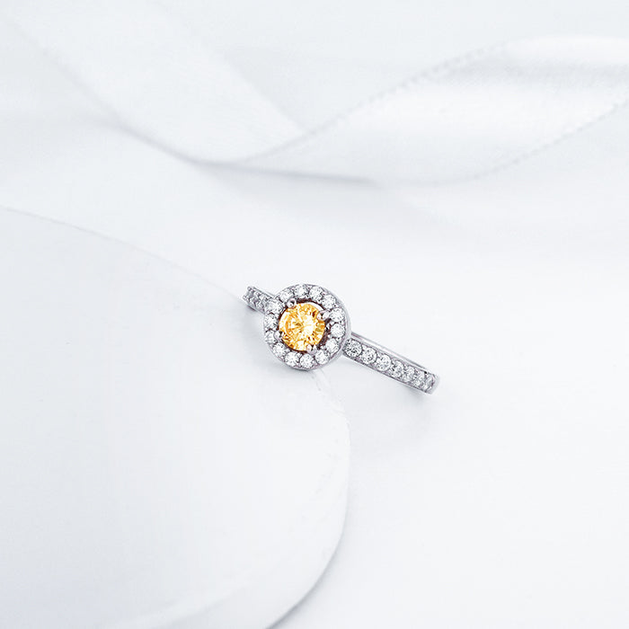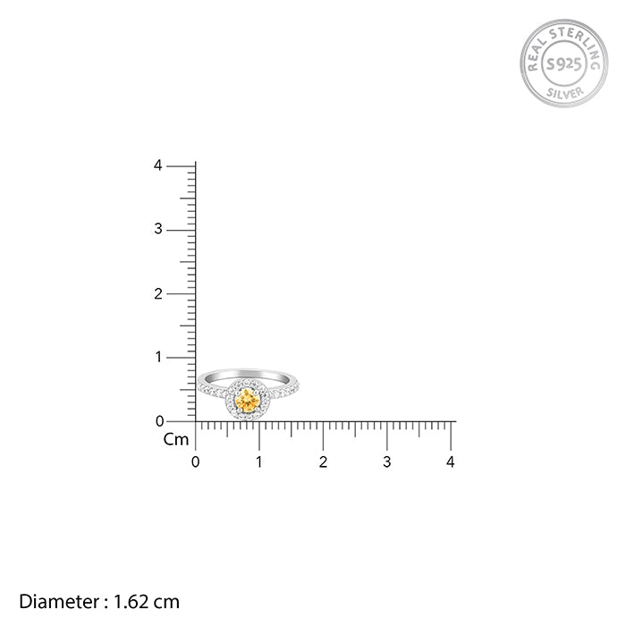 This silver ring features a single stone circular stone, nestled with zircon around it, sitting on a band with zircons.