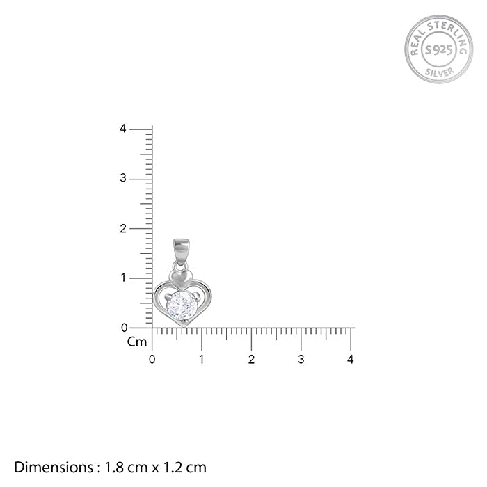 This silver pendant for women features a hollowed-out sleek heart motif, with a smaller solid heart motif sitting above. A solo round zircon is placed within the heart motif.