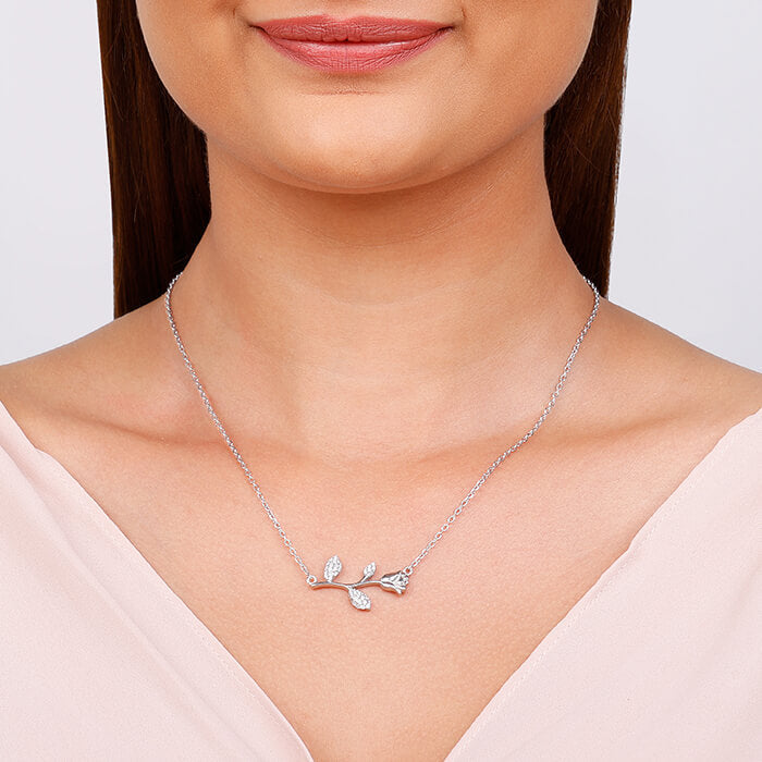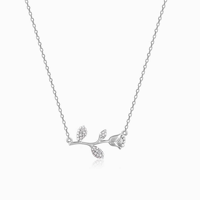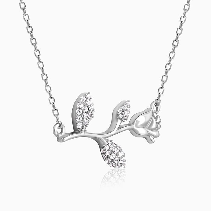 The Silver Zircon Studded Rose Necklace is inspired by an everlasting rose gift for Valentine's.