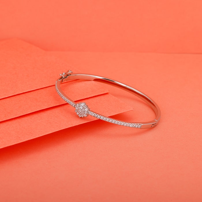 The silver bracelet has a zircon studded bracelet band and a floral motif at the centre embellished with zircons