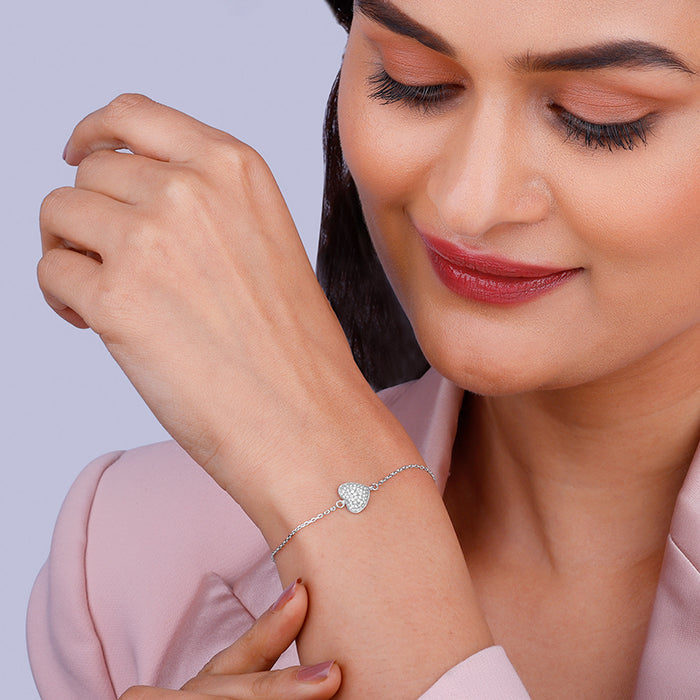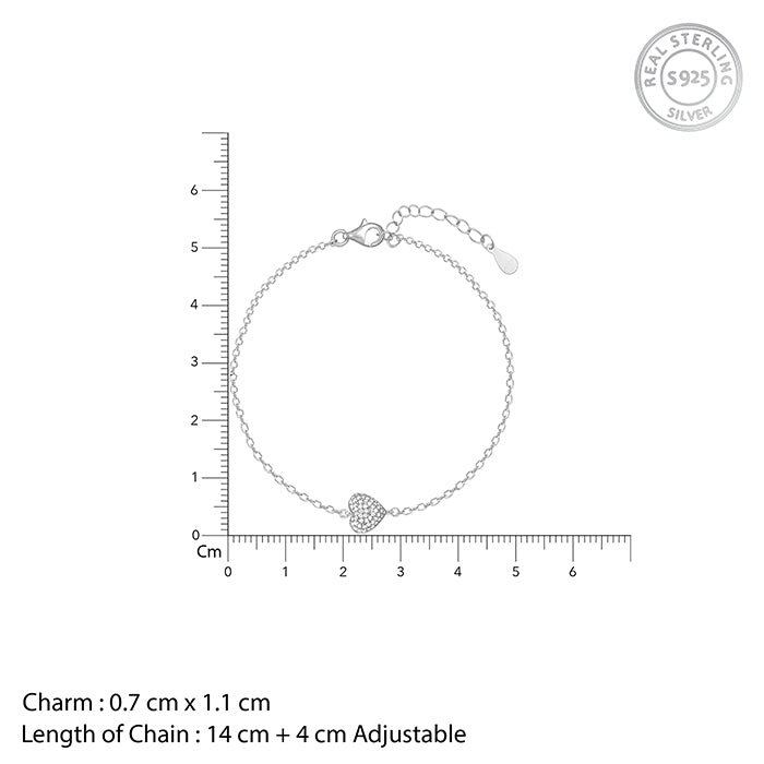 The silver bracelet features a dainty 3D heart studded with Zircon