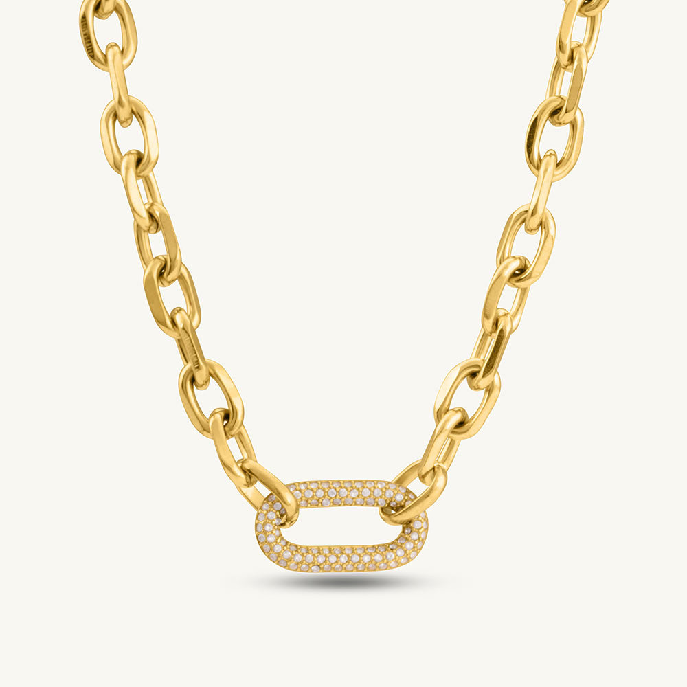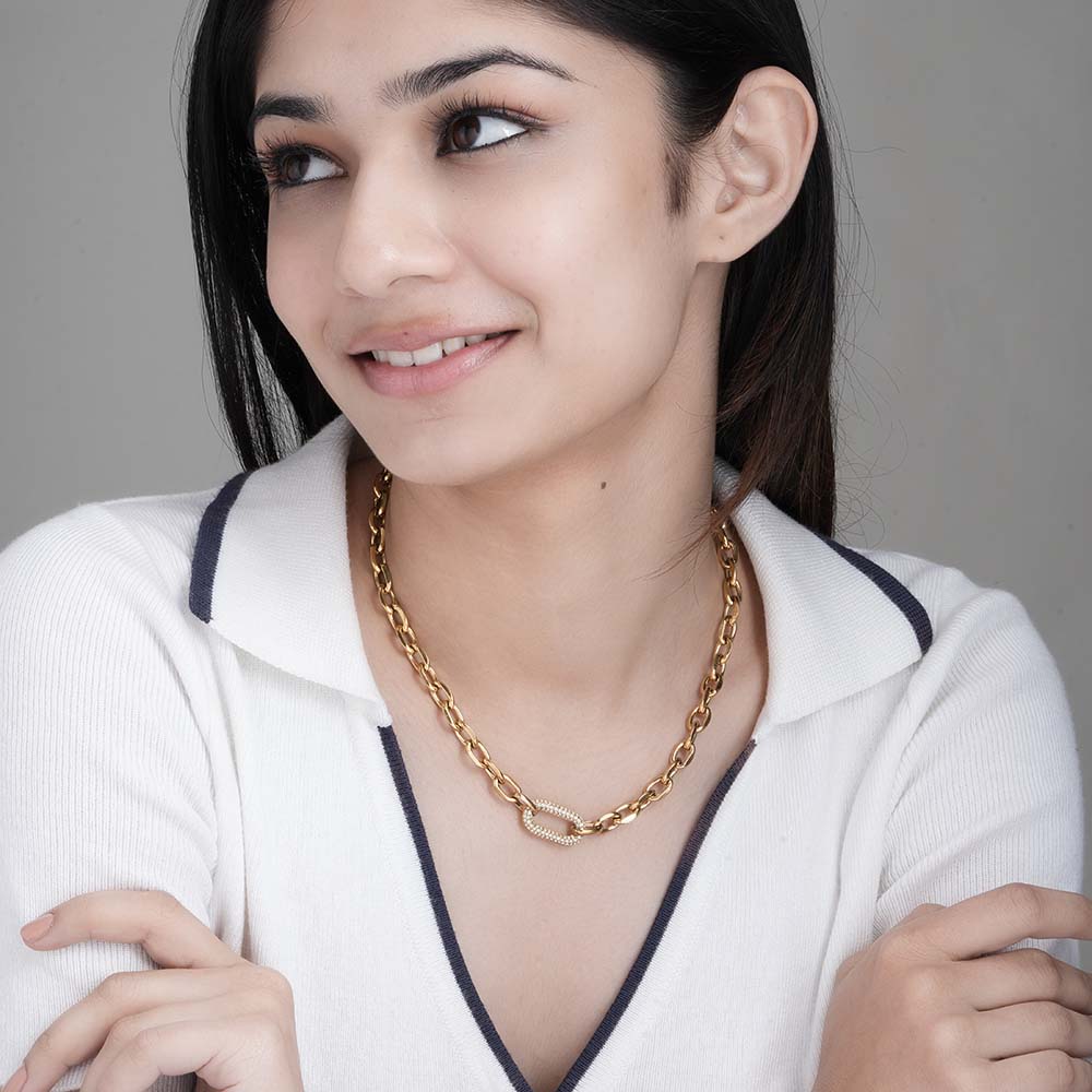 The Sparkle Link Chain Necklace is a glamorous jewellery piece featuring shimmering cubic zirconia embedded along bold gold-plated links. Crafted in 18k gold-plated stainless steel, this necklace adds a touch of sparkle and contemporary elegance to any outfit. Perfect for layering or wearing solo, it elevates casual, office, and evening ensembles with statement-making sophistication.
