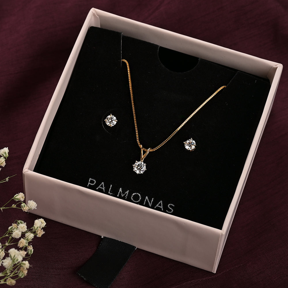 Alluring solitaire diamond pendant necklace crafted in 18k gold plating comes with a matching pair of solitaire diamond stud earrings. Sparkling diamond set that gives a mesmerizing look!