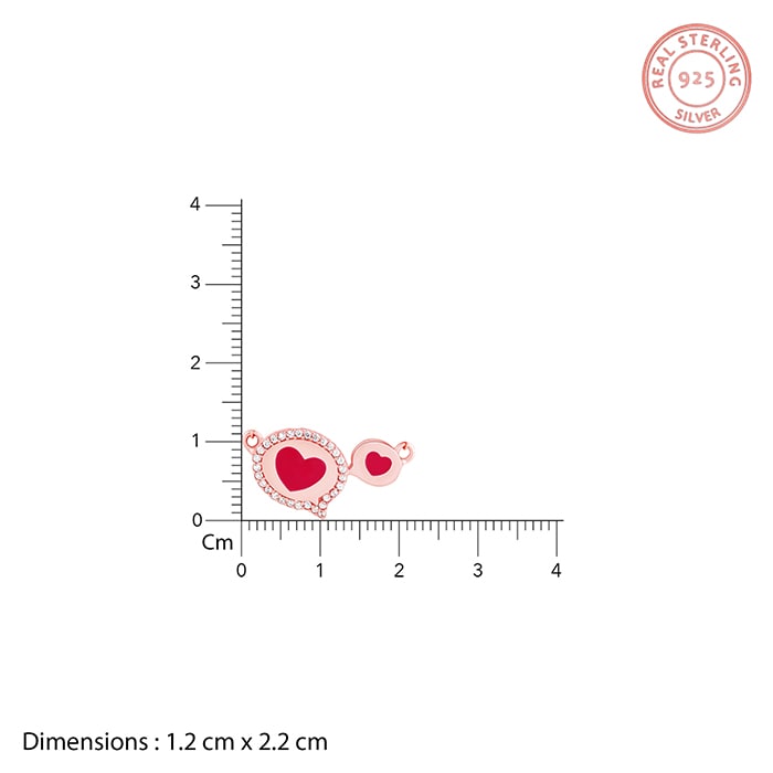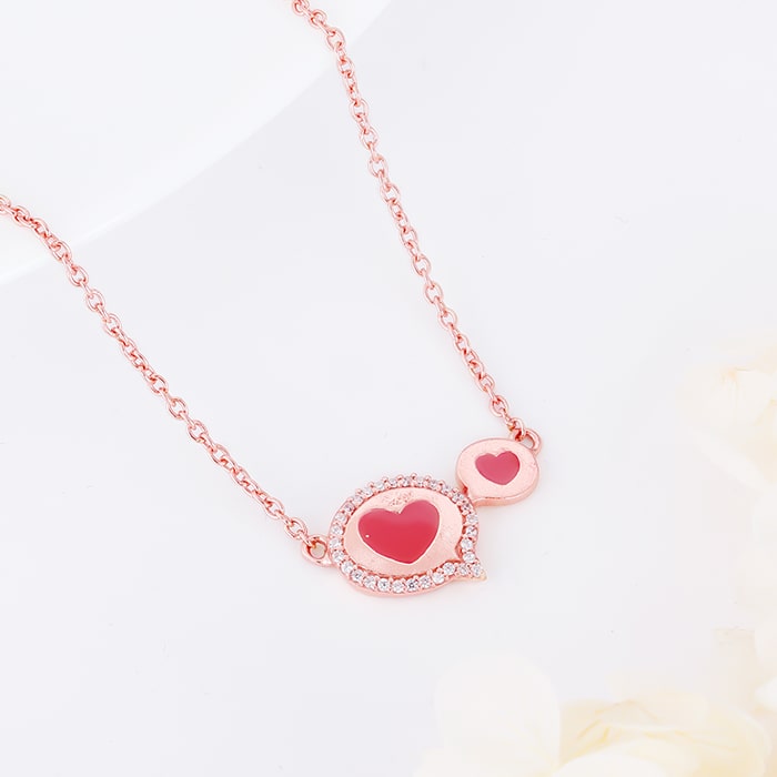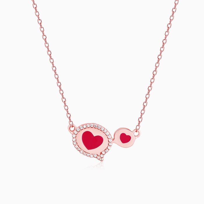 The rose gold necklace features a chat message design with a red heart design at the centre.