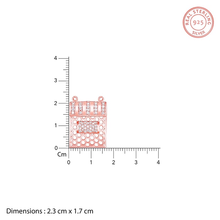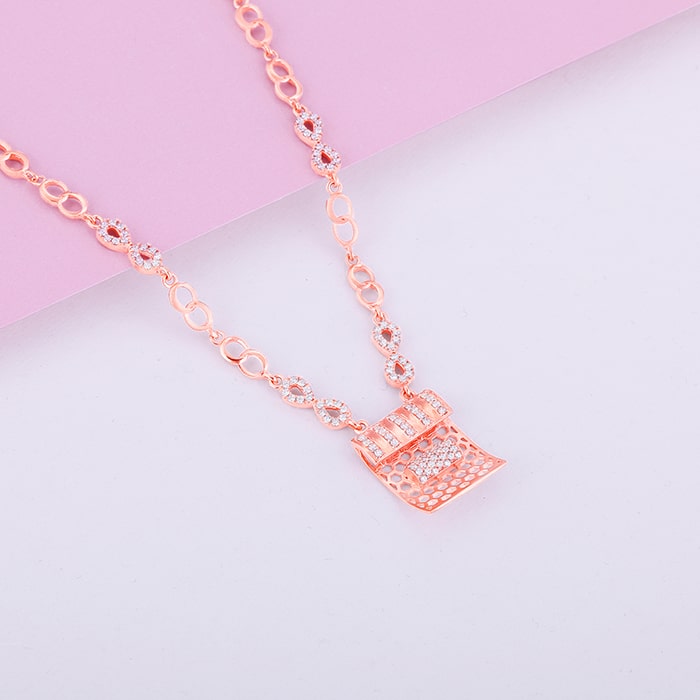 The Rose Gold necklace has a pendant with a filigree design and zircons studded on it, the chain has detail on it.