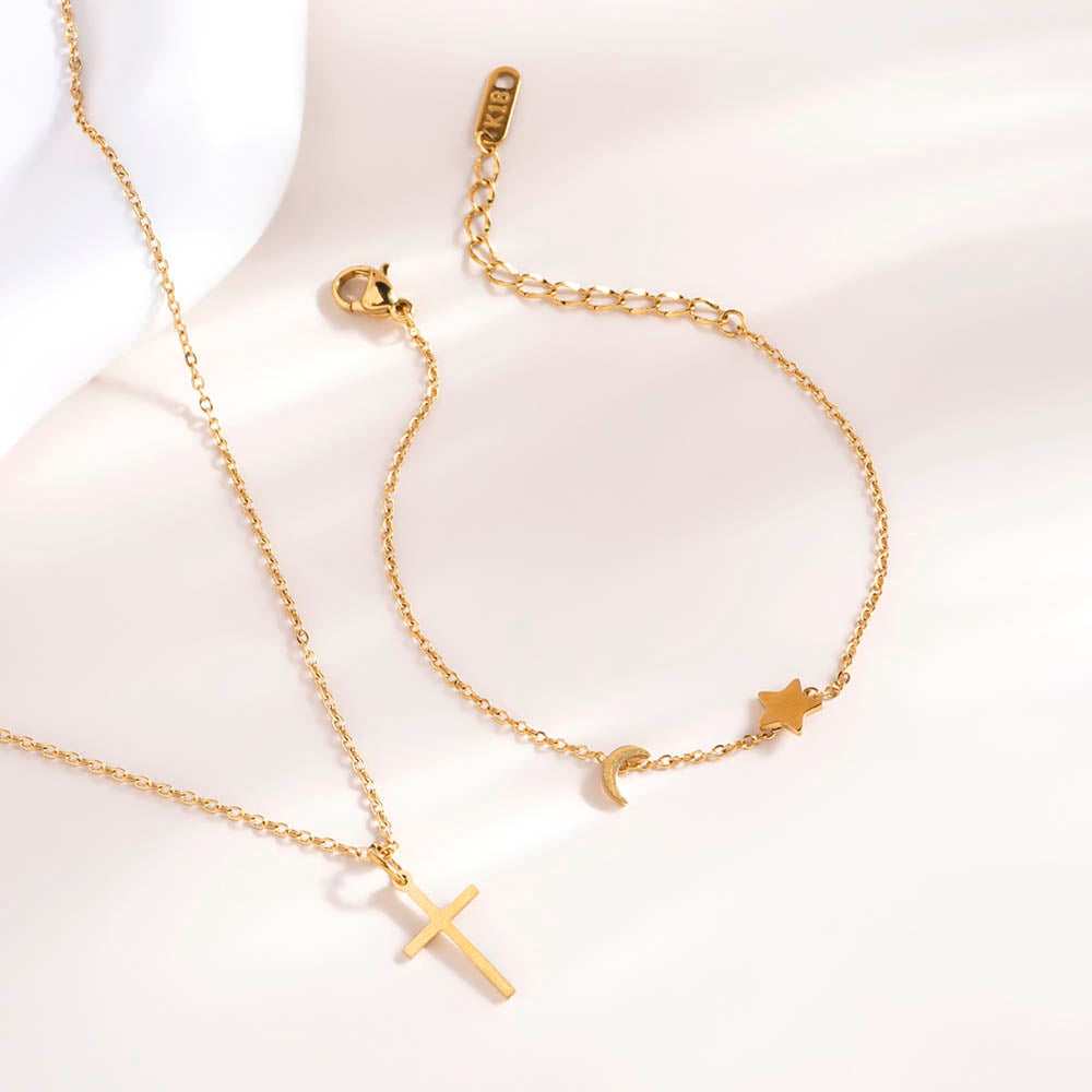 Star Moon Bracelet & Golden Cross Necklace Combo Set