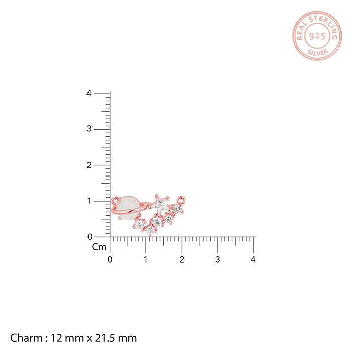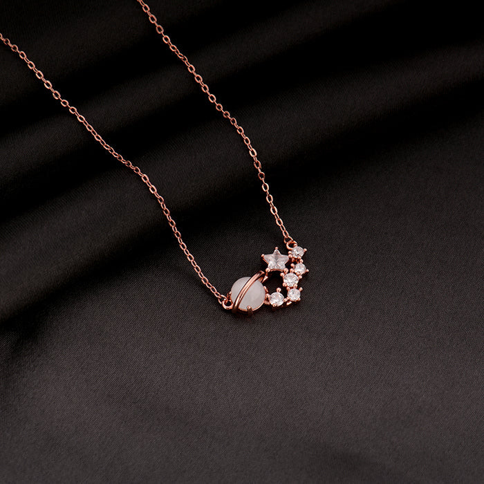 The rose gold necklace has Saturn with its ring, stars, and other celestial bodies made from zircons.
