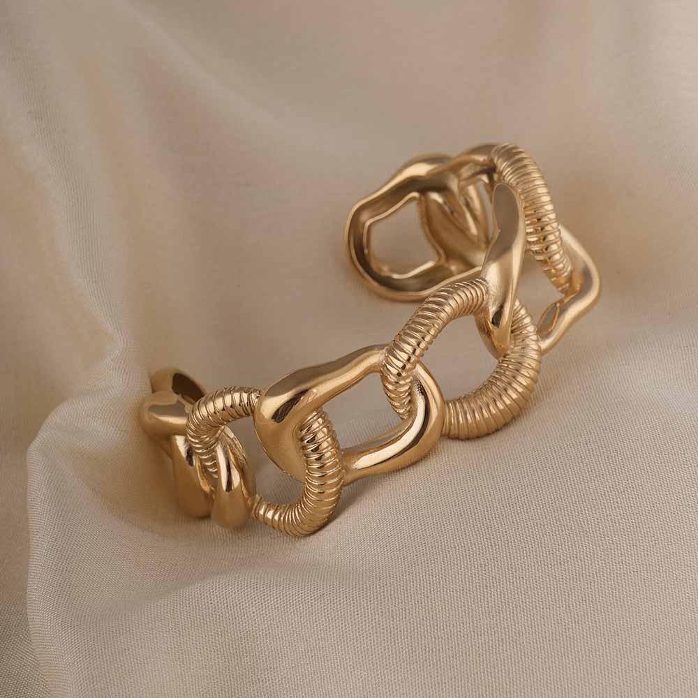 The Statement Gold Cuff Bracelet is designed for women who love bold yet timeless jewellery. Its wide design in a rich 18k gold tone makes it a versatile piece that instantly elevates any outfit. Whether you’re dressing for a formal event, a festive occasion, or simply adding a touch of glamour to your everyday style, this bracelet is sure to stand out. Lightweight on the wrist yet impactful in appearance, it’s the perfect blend of elegance and confidence.