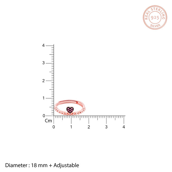 The Rose Gold Red Hearts Ring has a heart shaped motif with red coloured stones.