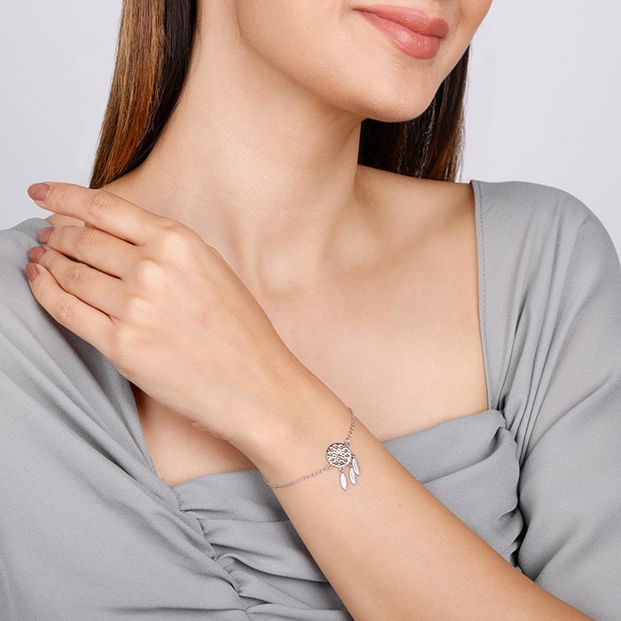 The silver bracelet has a dreamcatcher design with feather-like shapes dangling from it.