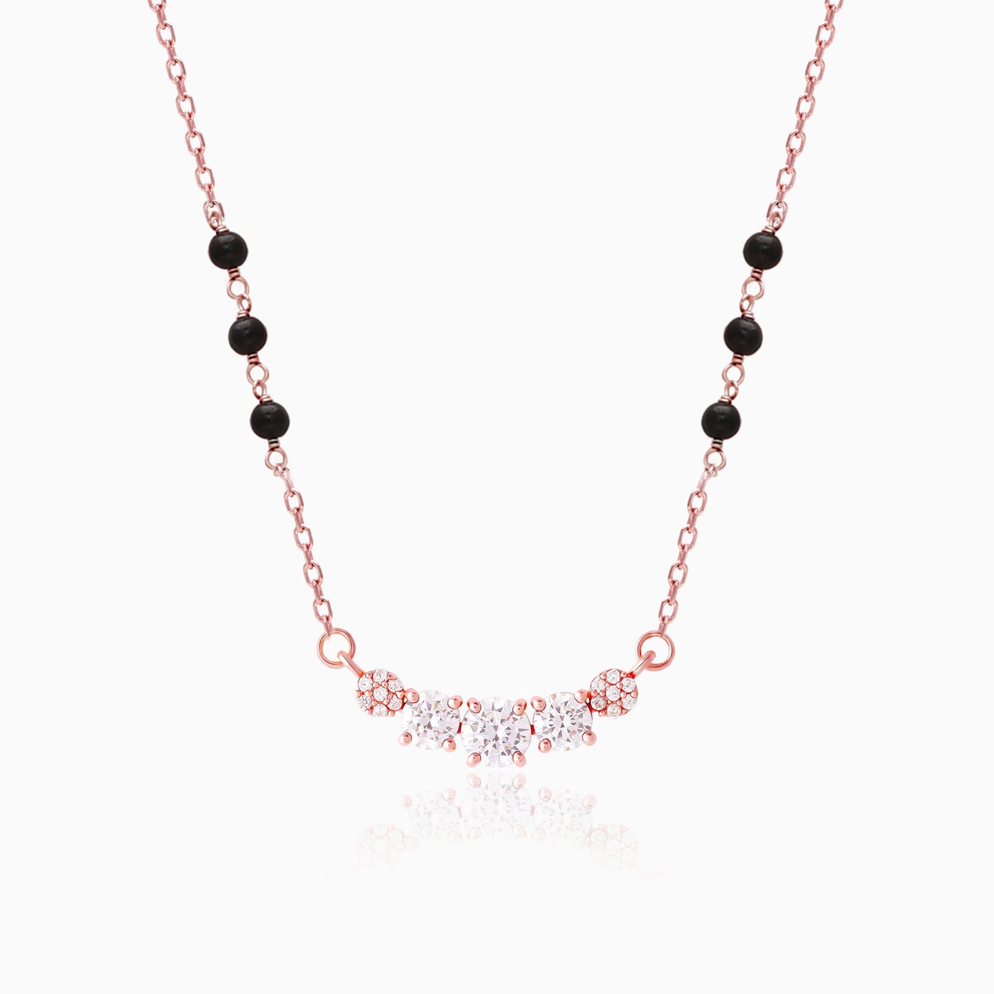 The rose gold mangalsutra features three circle zircons at the center, with two flower motifs studded with zircon on each side. The chain is adorned with three black beads on each side.