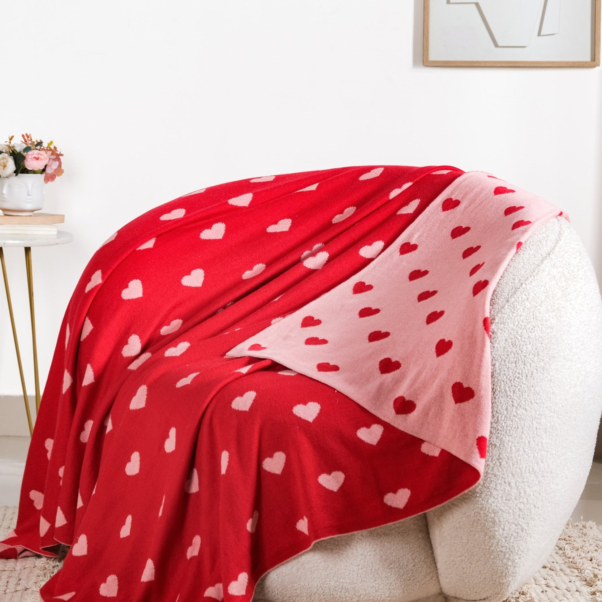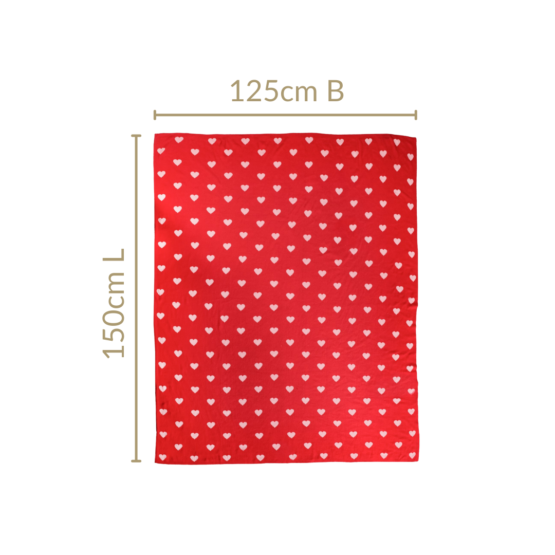 Design: Perfect for layering on your bed, this throw blanket features a playful reversible pattern that effortlessly blends a pop of charm with functionality. One side showcases a vibrant red base adorned with delicate pink hearts, while the flip side switches things up with a soft pink base and striking red hearts. The fine-knit craftsmanship lends a smooth and elegant texture, making this blanket as delightful to look at as it is to use.