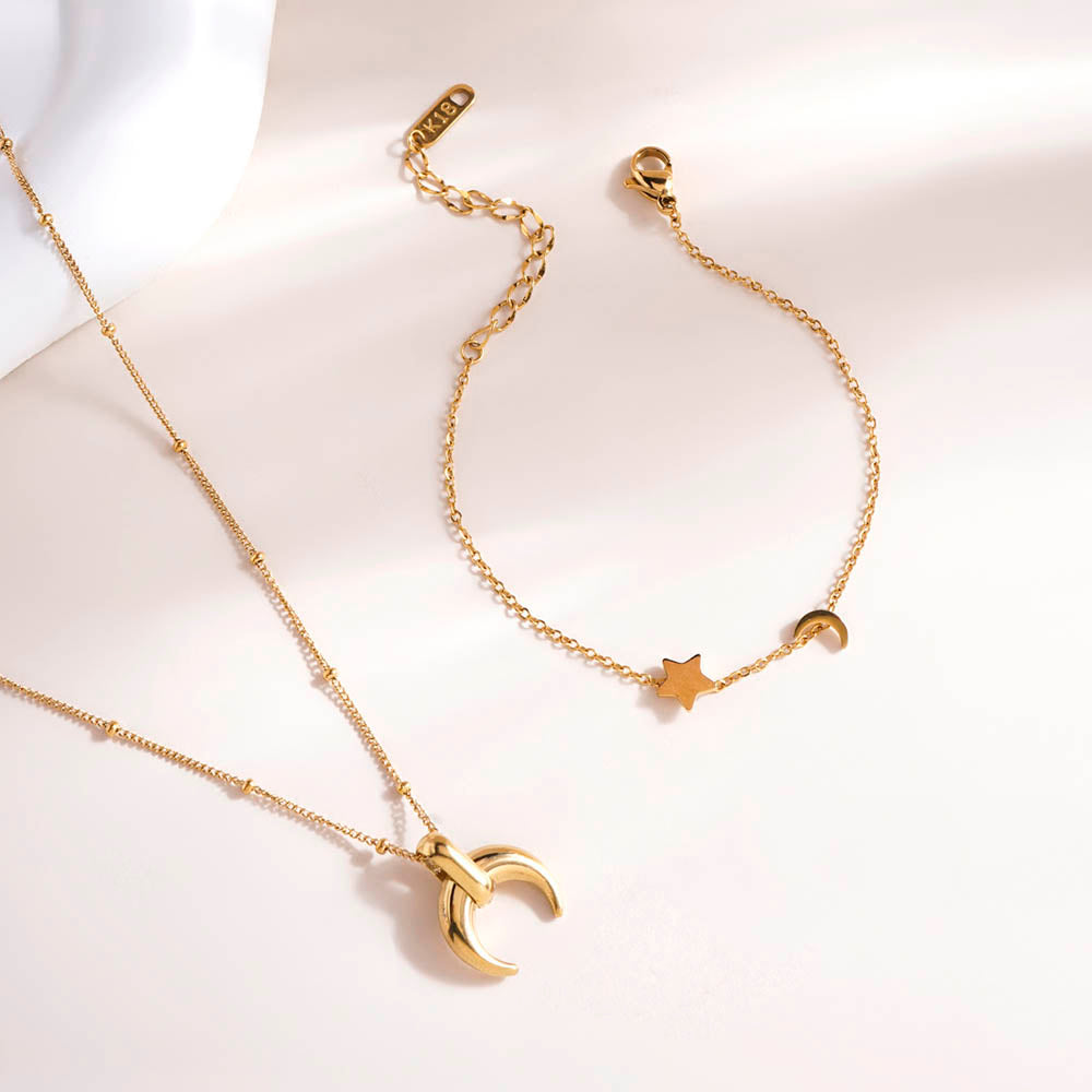 Tiny Horn Necklace & Star Moon Bracelet Combo Set