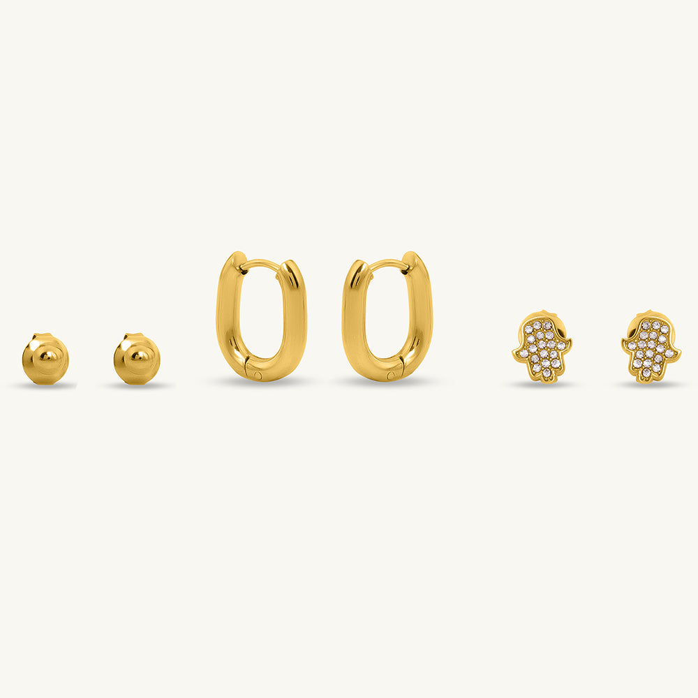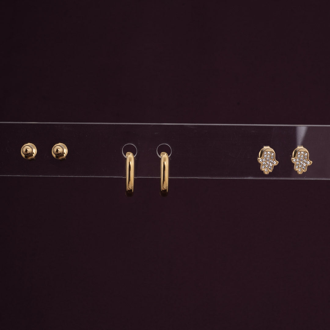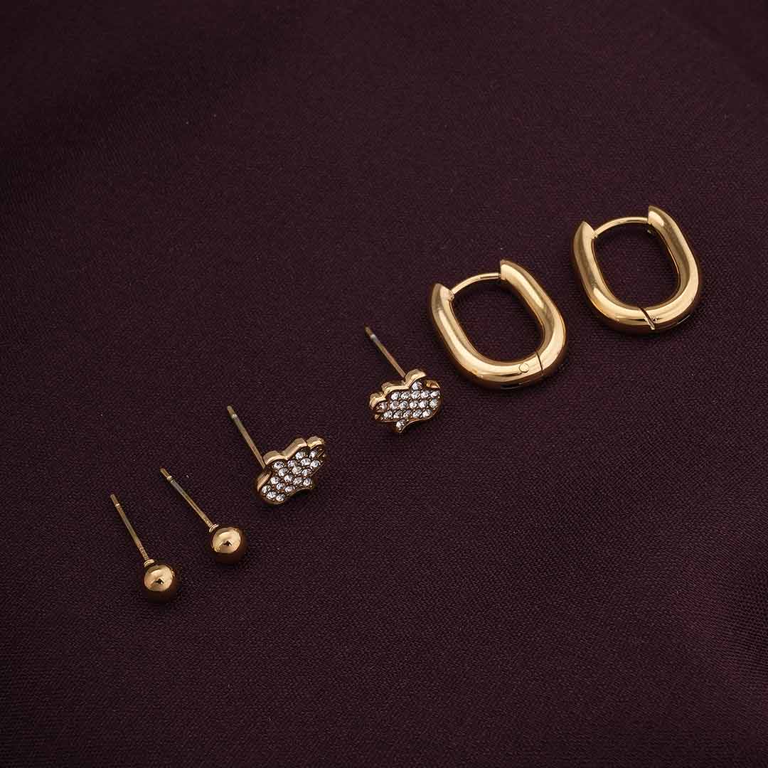 Add a touch of delicate sparkle to your everyday style with this Tiny Treasures earrings set. Crafted from durable stainless steel with radiant 18k gold plating, each earring is adorned with shimmering white cubic zirconia stones for subtle elegance. Perfect for layering or wearing individually, this set blends versatility with refined charm for any occasion.