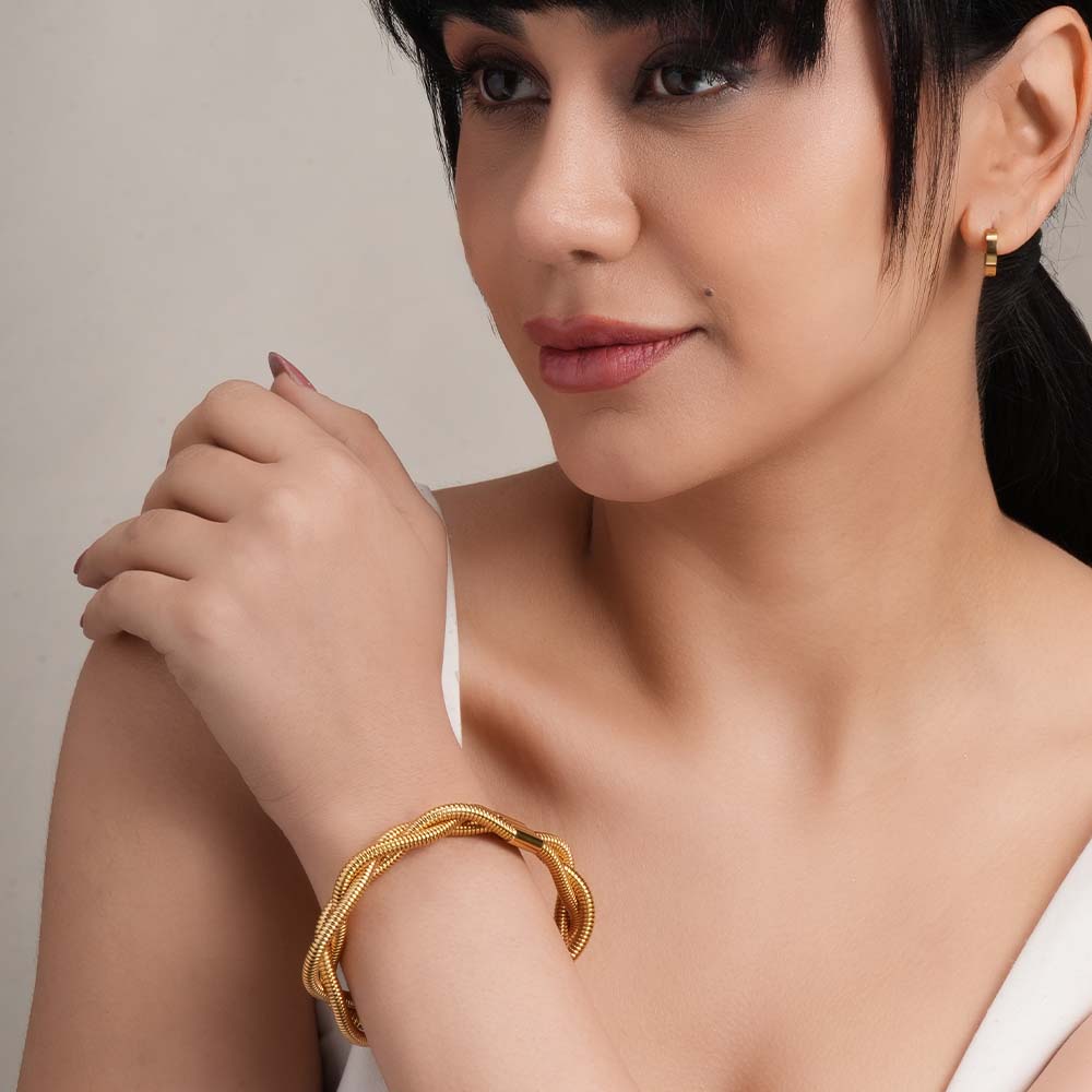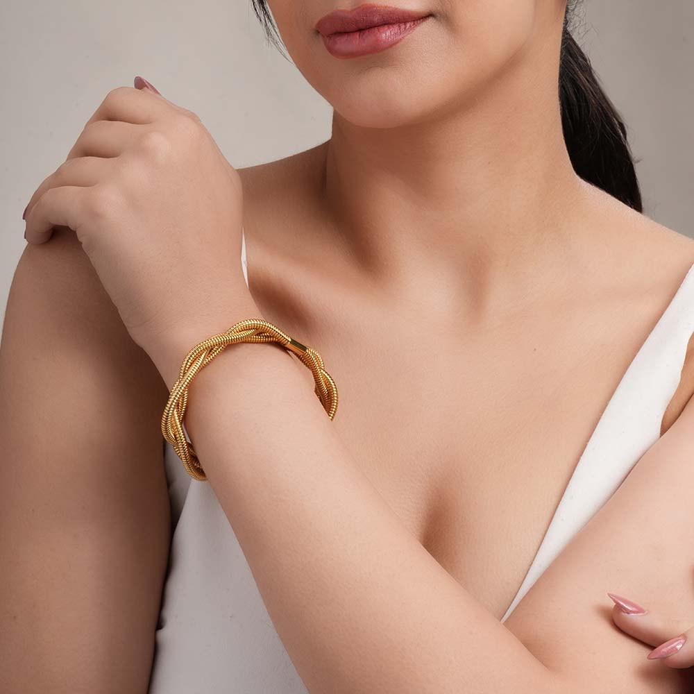 The Tri Spiral Wire Bracelet embodies fluid motion and modern artistry. Crafted in stainless steel with radiant 18k gold plating, its triple-spiral design creates a sculptural silhouette that wraps elegantly around the wrist. Waterproof, anti-tarnish, and skin-friendly, this bracelet combines strength with sophistication - a statement piece that adds dimension, texture, and effortless elegance to any ensemble.
