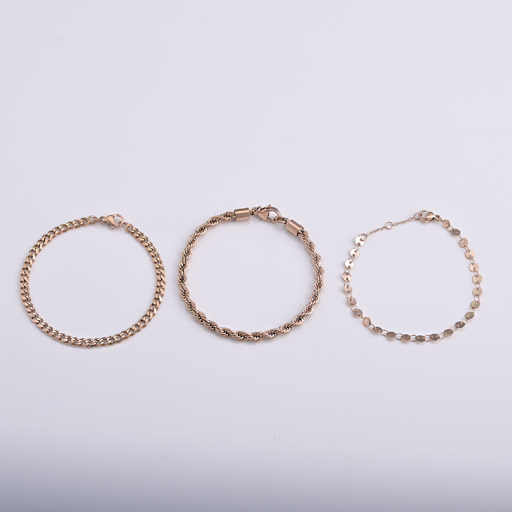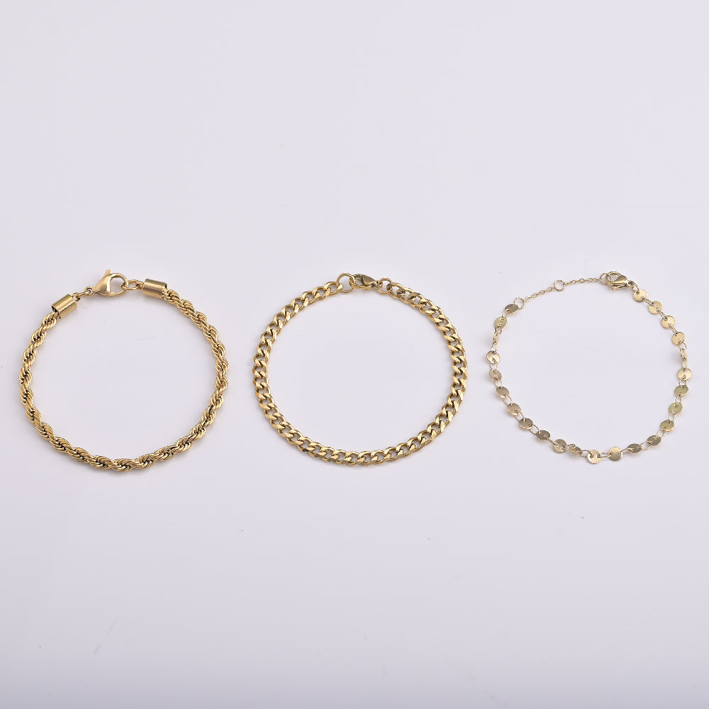 The trio of chains bracelet is a combination of a rope chain, a plate chain, and a curb chain bracelet. This bracelet for women is a statement piece when worn as a set. It can add interest and texture to any outfit. Each piece in this set of trendy bracelets has a unique design on its own.