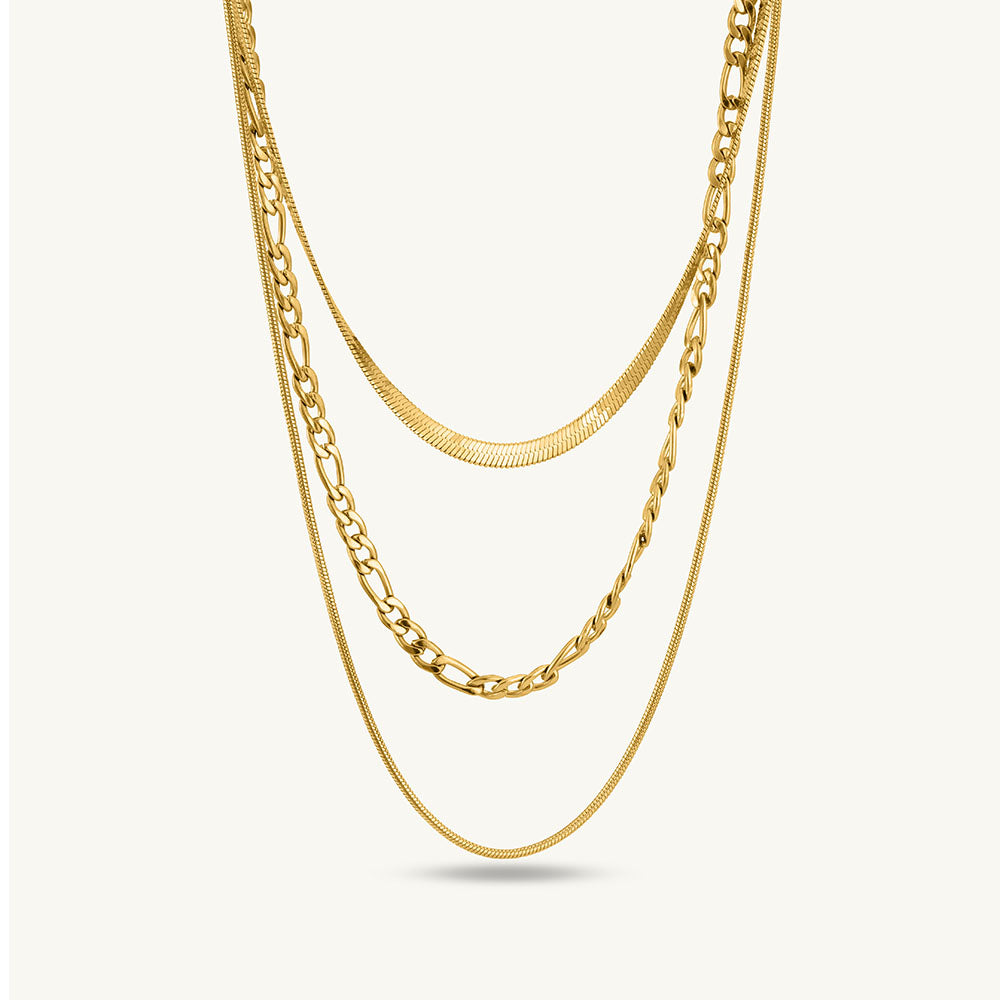 The Triple Strand Layered Gold Necklace is a bold statement piece that exudes modern sophistication. Crafted in 18k gold-plated stainless steel, its three interwoven layers create depth and texture, making it perfect for elevating both casual and formal outfits. Versatile and eye-catching, this necklace can be worn solo or paired with delicate chains for a layered jewellery look that turns heads.