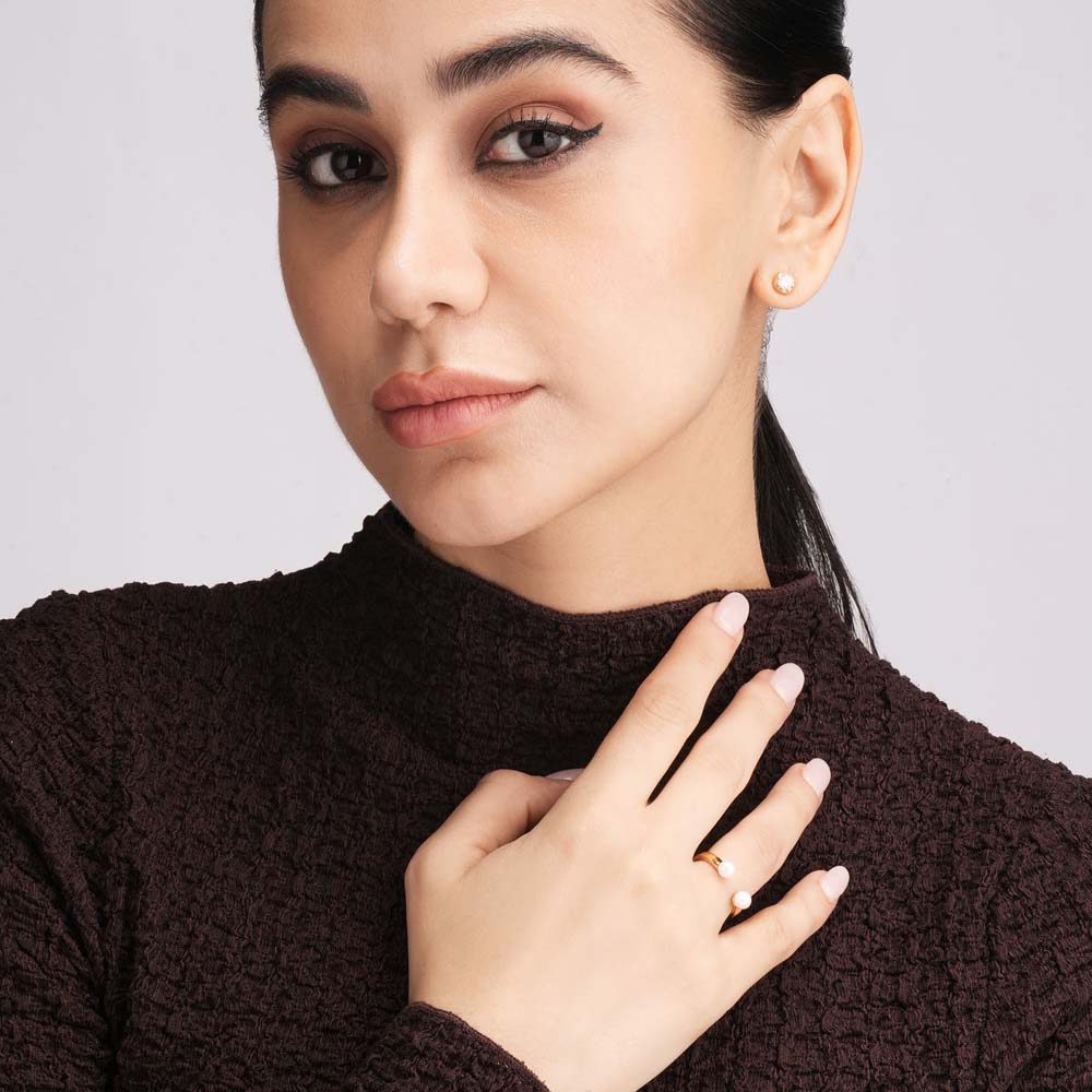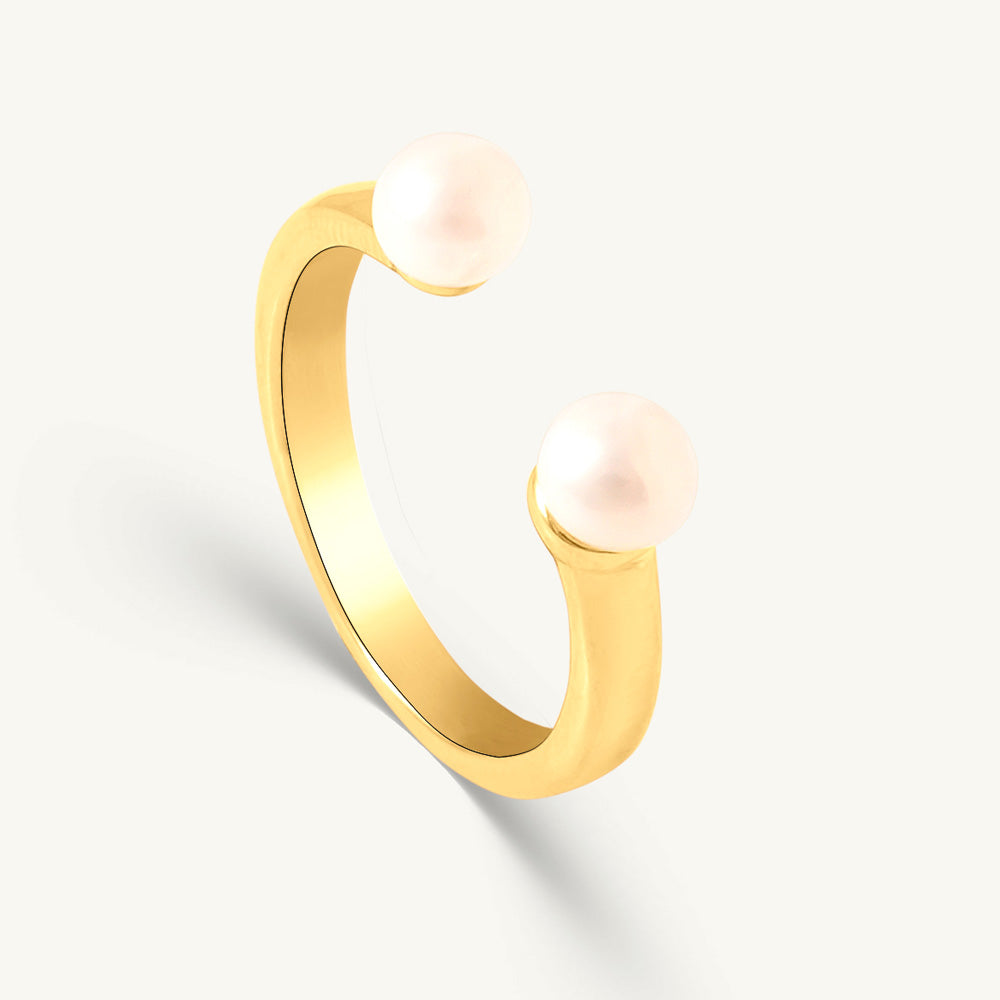 The Twin Pearls Minimal Open Band is an elegant and versatile design that celebrates the beauty of symmetry. Featuring two radiant pearls placed delicately on either side of an open golden band, it offers a clean and minimal look. Ideal for women who love dainty pearl rings, it adds effortless sophistication to casual outfits and a refined touch to formal wear. Lightweight and chic, this open band design is also fully adjustable, making it a versatile piece for any collection.