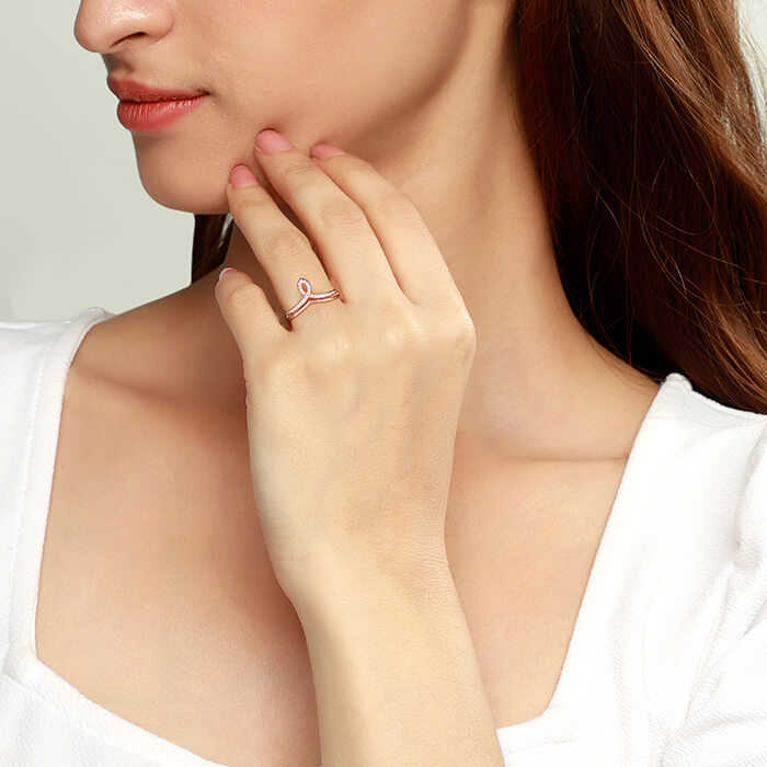 The Rose Gold Ring has a loop at the centre pointed to the top with zircons studded on it.