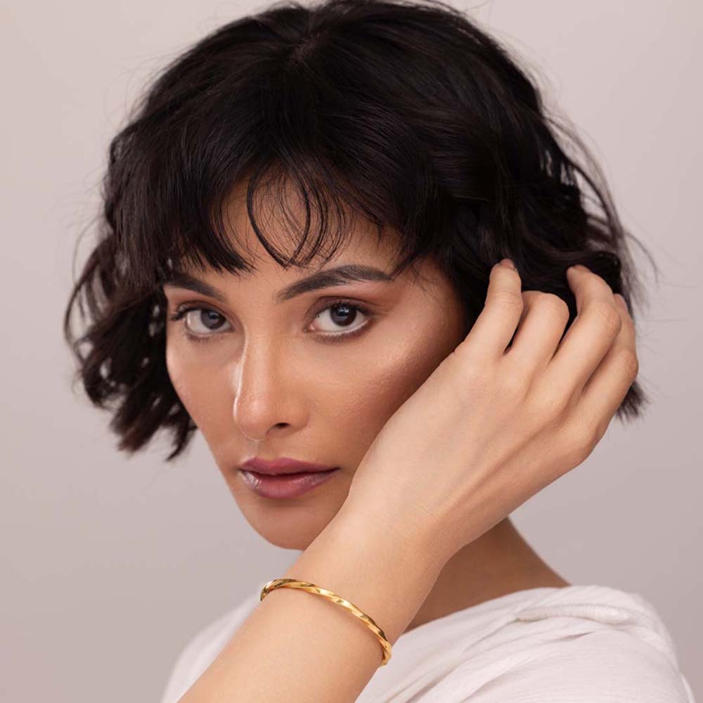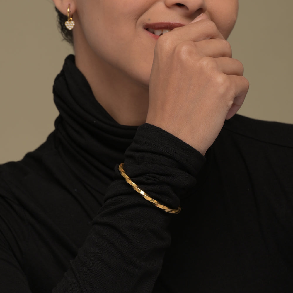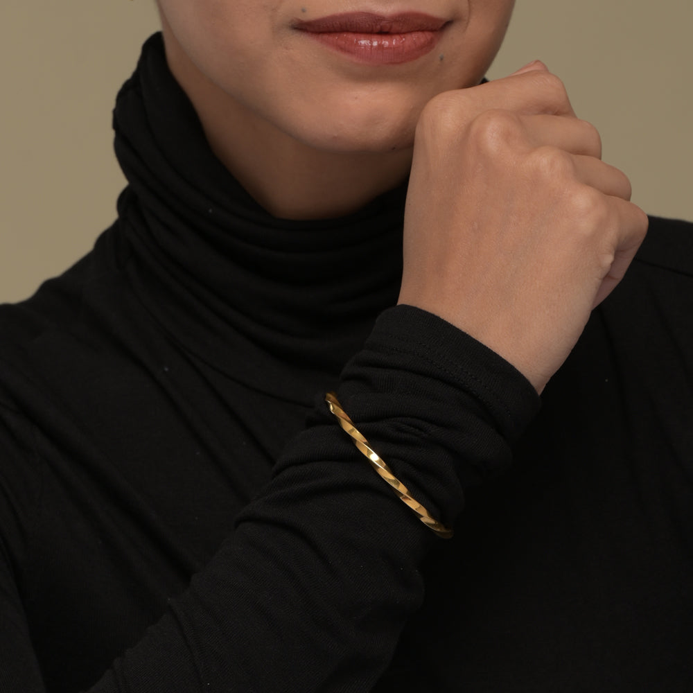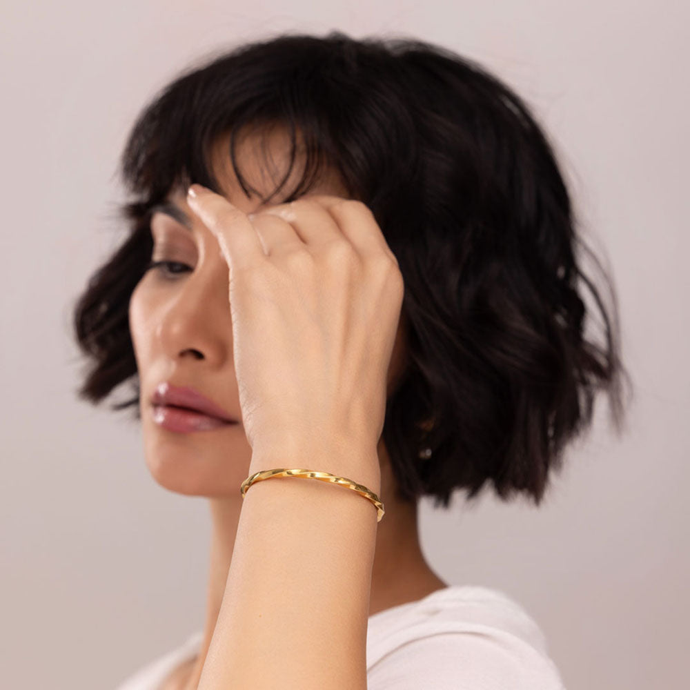 The twisted bar bracelet has a unique and modern design that adds a touch of edge and stylish look to your outfit. The twisted design creates a sense of dynamism and movement to the bracelet.