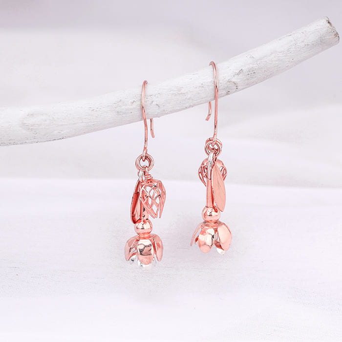 These rose gold earrings have a bud motif of Brahma Kamal with silver 'petals'. When you pull the string the flower blooms it's the unique feature of this earring. Celebrate the beauty of nature's rarest blooms with Trendy Freak and Bhumi Pednekar's new jewellery line - The Bhumi Collection.