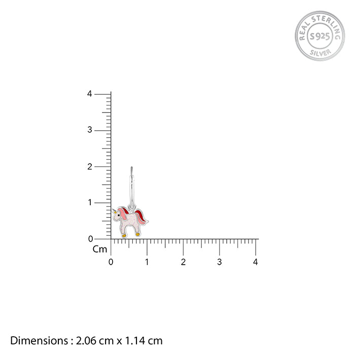 The silver kids earrings have a hoop with a unicorn charm dangling from it.