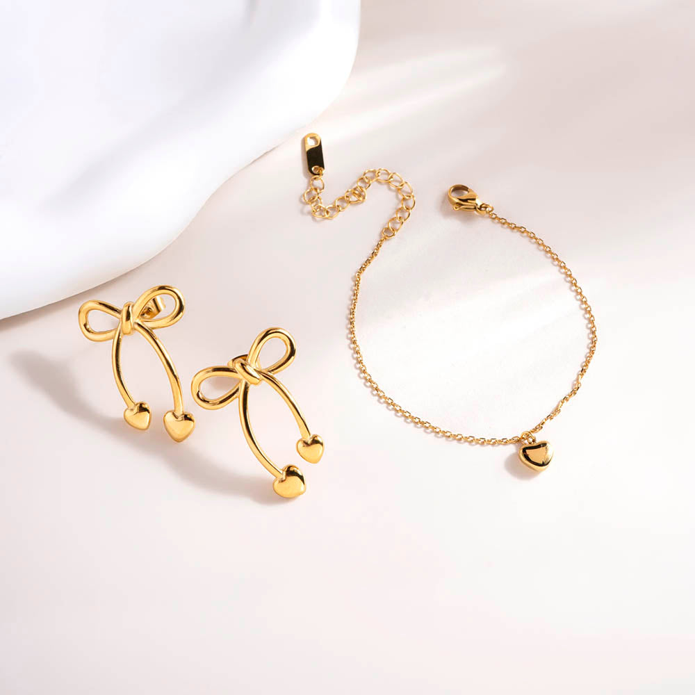 Unique Gold Bow & Heart Drop Earrings & Cute Heart Bracelet Combo Set