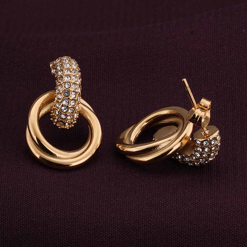 Bold yet versatile, the Urban Edge Gold Stud Earrings are crafted in stainless steel with an 18k gold finish, bringing a modern statement to your accessory collection. Embellished with luminous white cubic zirconia, these earrings strike the perfect balance between contemporary design and timeless shine. Their waterproof and anti-tarnish quality ensures lasting brilliance, making them ideal for everyday wear as well as chic occasions.
