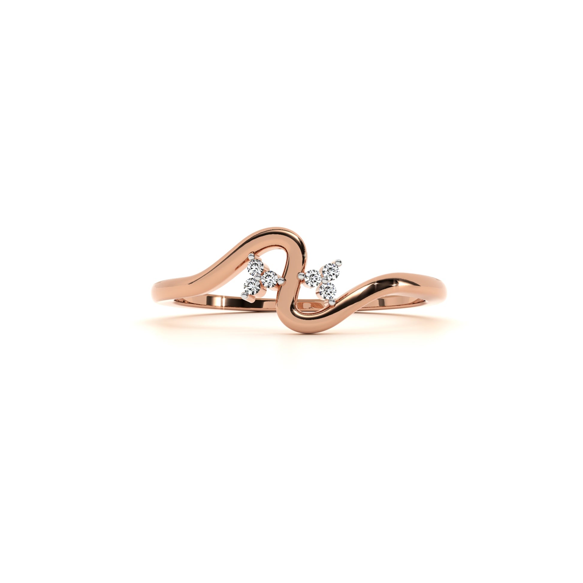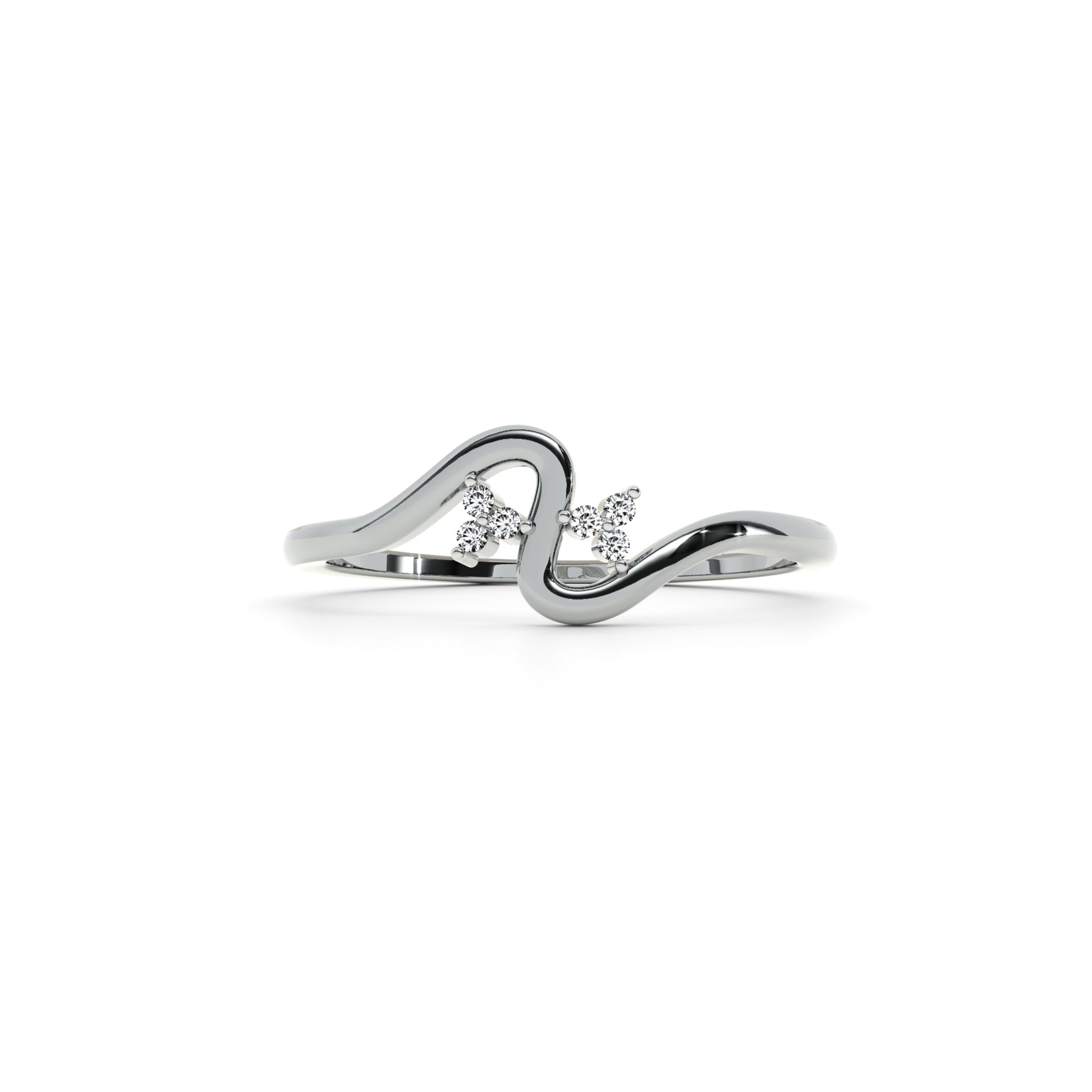 This delicate ring features two clusters of sparkling round-cut diamonds nestled within a gracefully flowing, wave-inspired band. The elegant curves create a harmonious balance of movement and brilliance, making it a sophisticated choice for everyday wear or special occasions. A refined piece that captures modern artistry and timeless elegance in one stunning design.