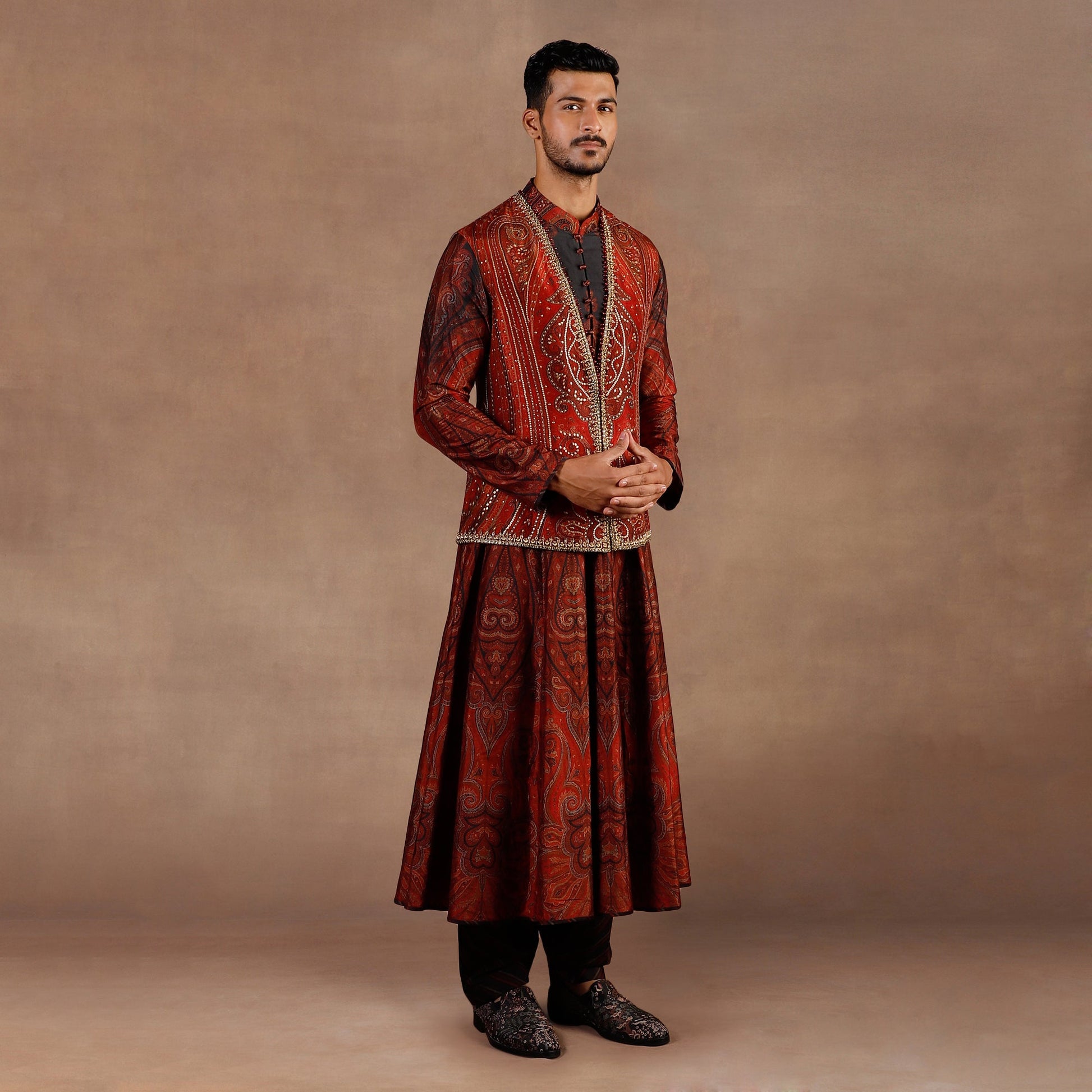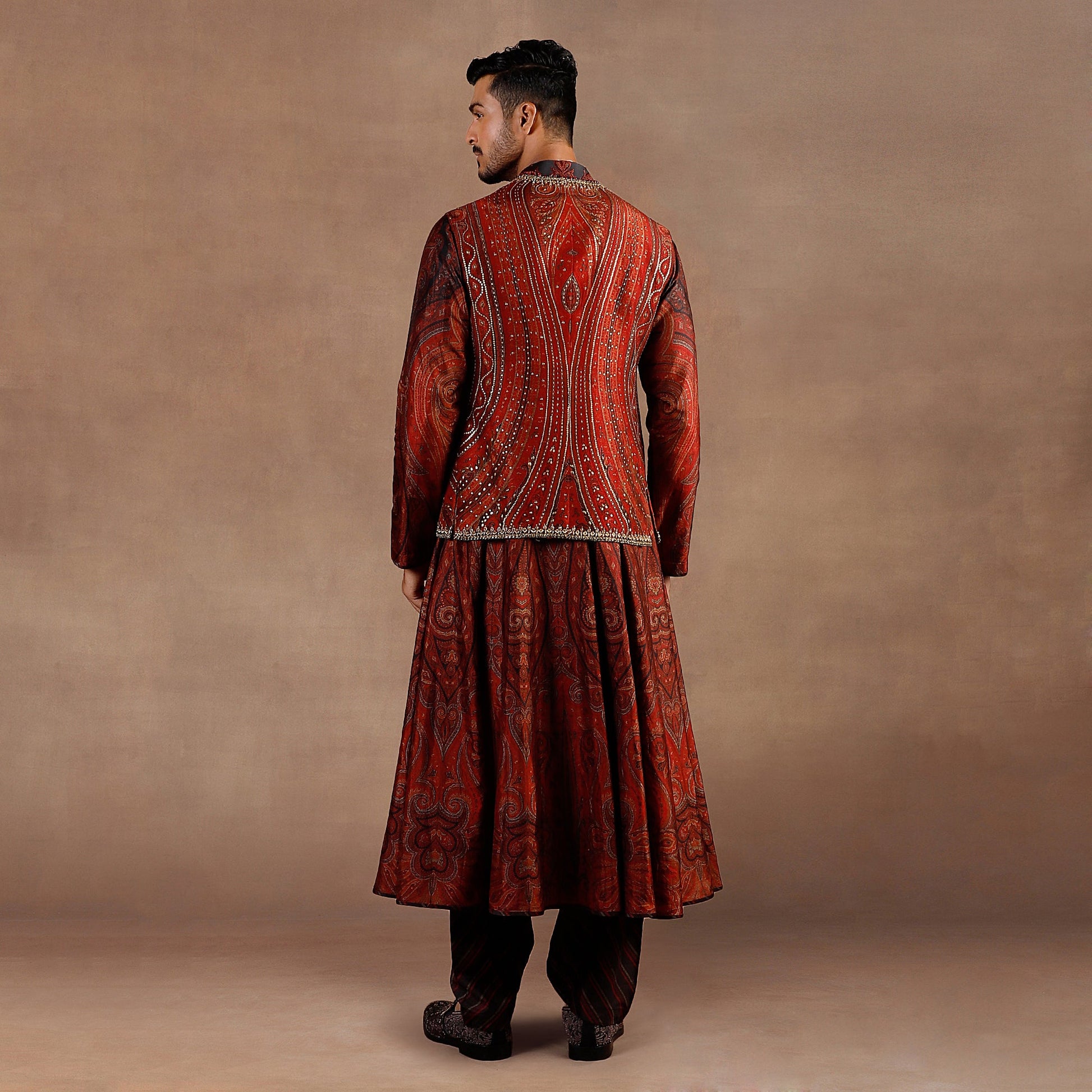 The Nehru jacket features a rich red jamawar print, enhanced with antique gold metallic embroidery, zari, sequins, and beads. Crystal accents throughout and beaded edging along the placket add refined detail. It is paired with a jamawar print choga and a burgundy salwar, creating a coordinated and striking ensemble.