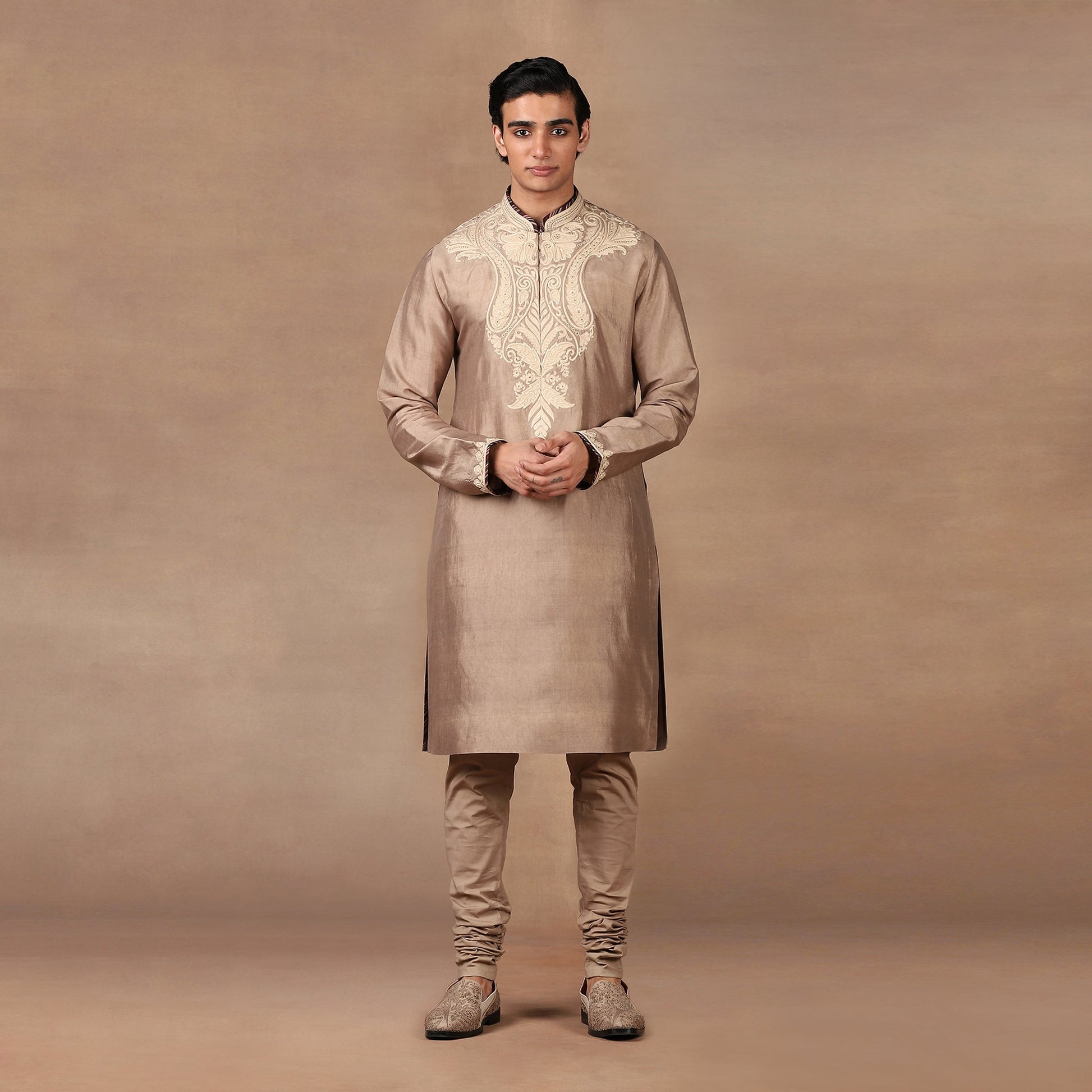 The Warm Taupe Kurta Set is completely handcrafted, featuring contrast resham threadwork embroidery along the neckline and cuffs. Paired with a matching churidar, it offers a refined yet understated look.