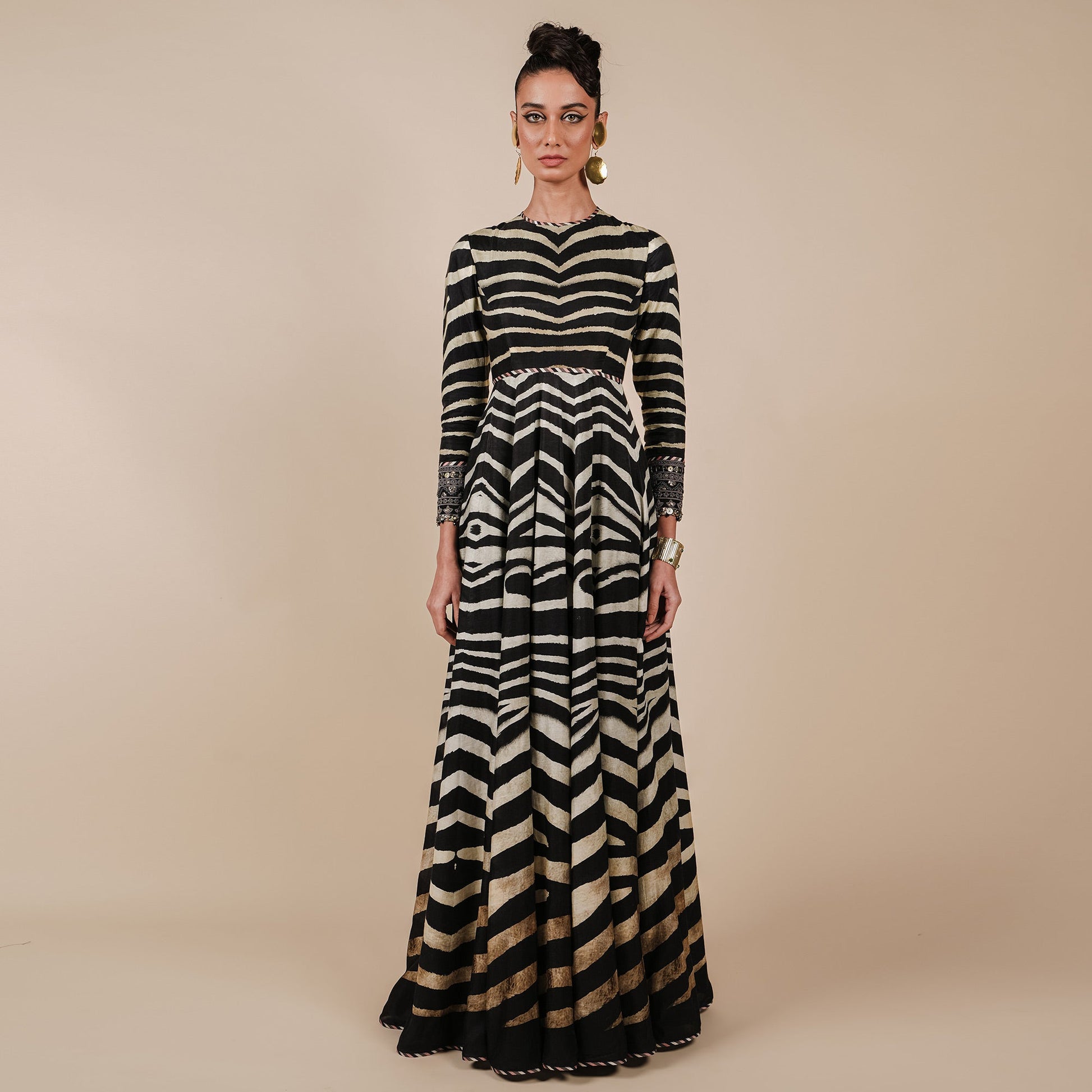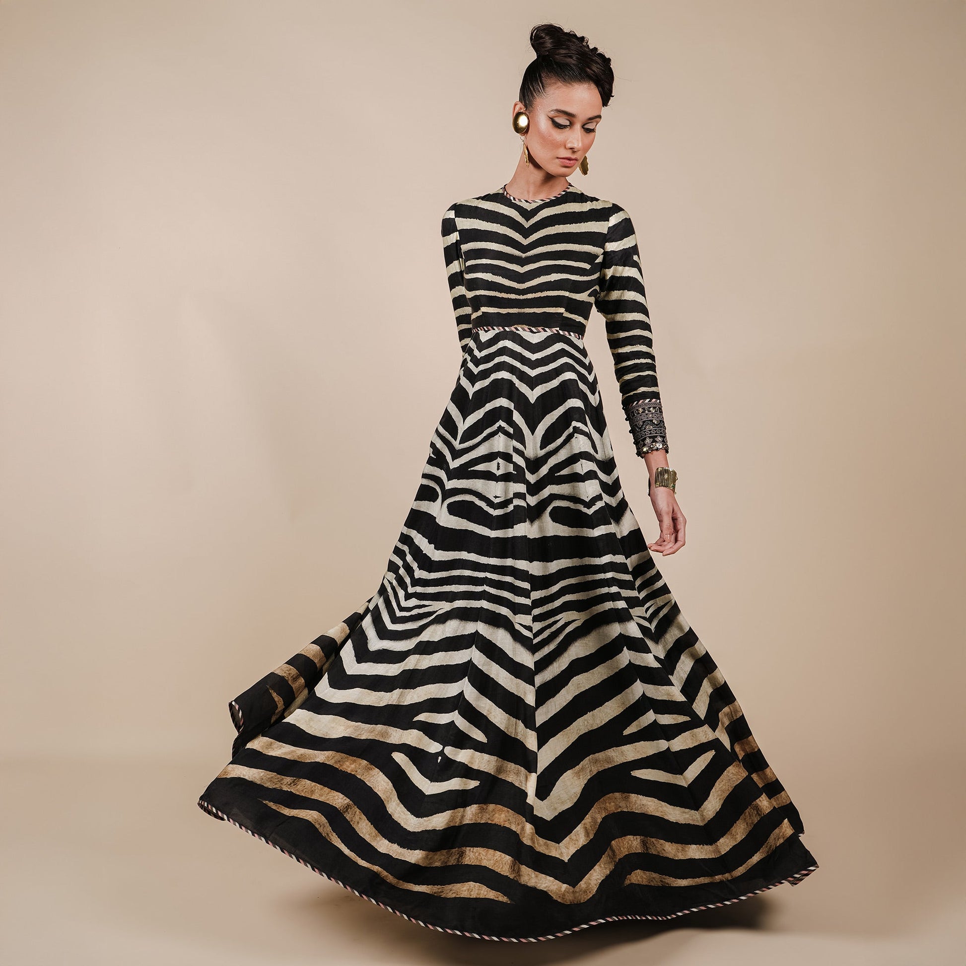 The Anarkali features a striking zebra print, complemented by intricate embroidery on the cuffs and striped piping for a refined touch. The back showcases a captivating criss-cross dori detail, adding an element of elegance and allure.