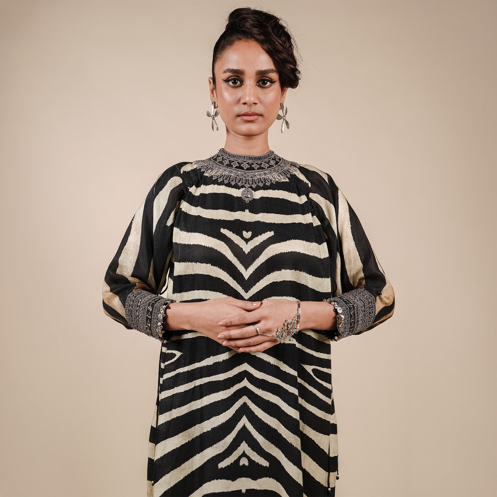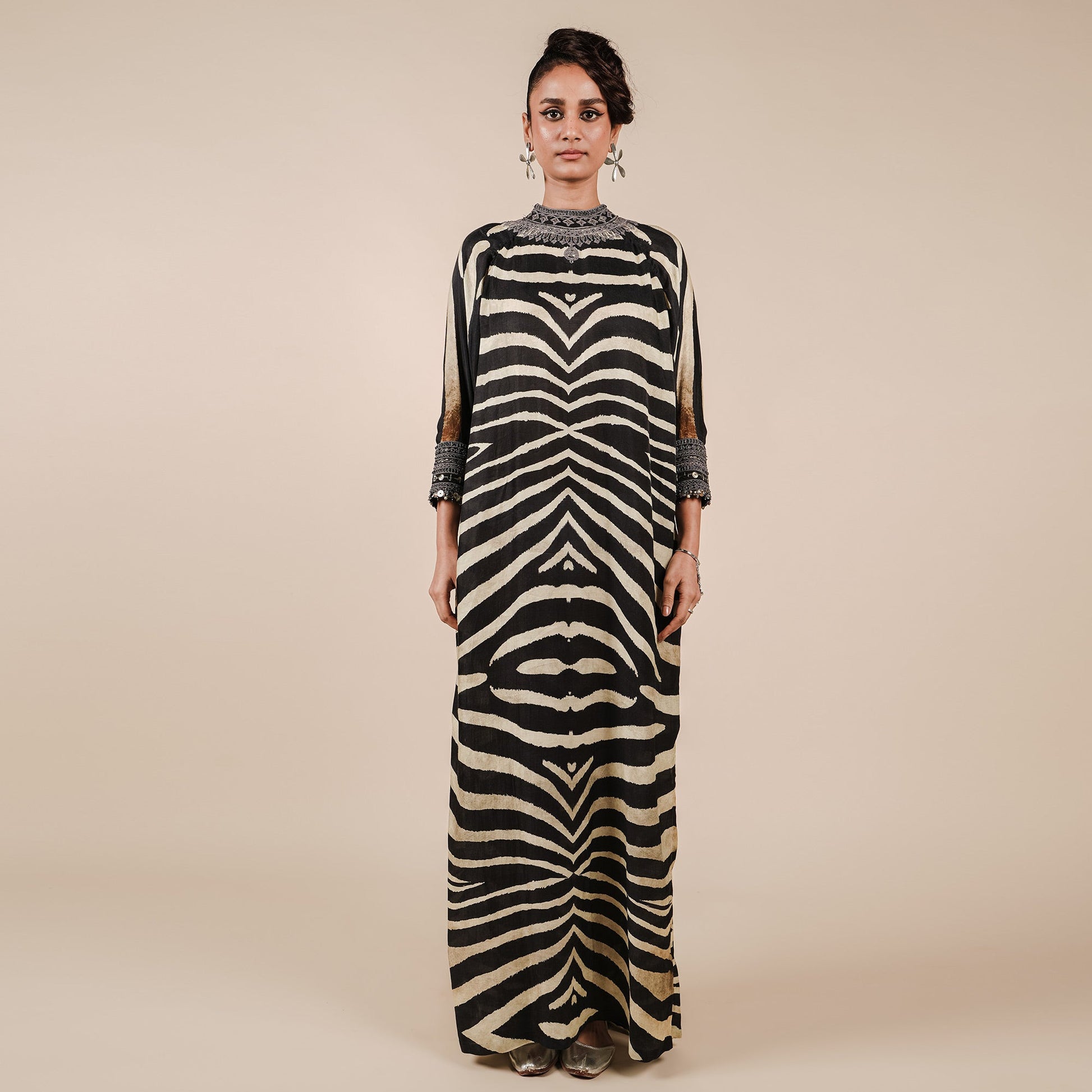 The Kaftan is adorned in a striking digital zebra print that exudes modern allure. The jewel neckline adds a touch of sophistication, while the cuffs are embellished with intricate embroidery for a hint of elegance.