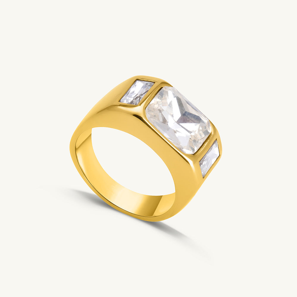The Zircon Studded Gold Chunky Ring brings together bold design and timeless elegance. Accented with three sparkling cubic zirconia stones, this chunky band is plated in 18k gold tone, making it perfect for those who love statement jewellery. Waterproof and anti-tarnish, it’s crafted for both durability and style - an ideal piece to elevate everyday looks or complete festive ensembles.